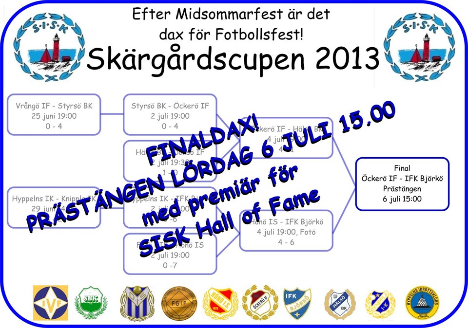 På lördag blir det Öckerö IF som möter IFK Björkö och gör upp om Skärgårdscupen 2013. Det blir också premiär för SISK Hall of Fame. Välkomna!
