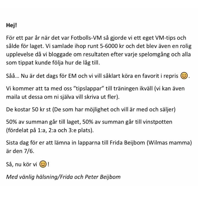 Hej på er! I dag har de tjejer som var på träningen provat ut storlek på overall. Priset för overallen är ca 750kr men vi ledare har ett förslag på att varje spelare betalar 500kr så lägger vi pengar från vinsten (EM tipset) på mellanskillnaden Hoppas det är ok? Se till att sälja många tips då vi även får in pengar till ngn rolig avslutning el ngt annat skoj👌 Hör av er om ni undrar över något F-09/10 19 maj 2021 1kommentar