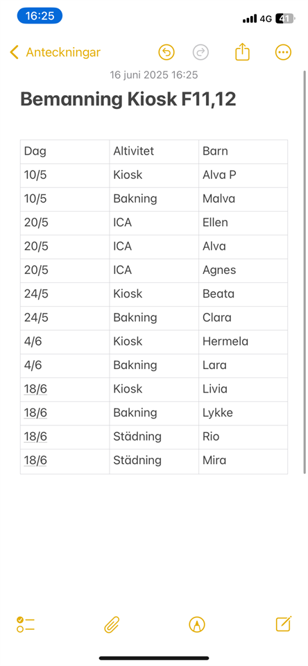 Här är vårens bemanning av kiosken i samband med våra hemmamatcher men även när det är städning i samband med träning.