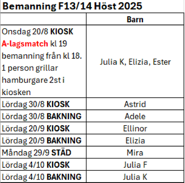 Här är schemat för höstens bemanning av kiosk, bakning och städ.