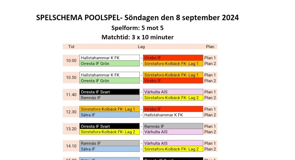 Hej här kommer spelschemat Orresta idag. Och om man missat så samlas vi på Orresta kl 9.30!!! P-16 8 sep 2024 0kommentarer