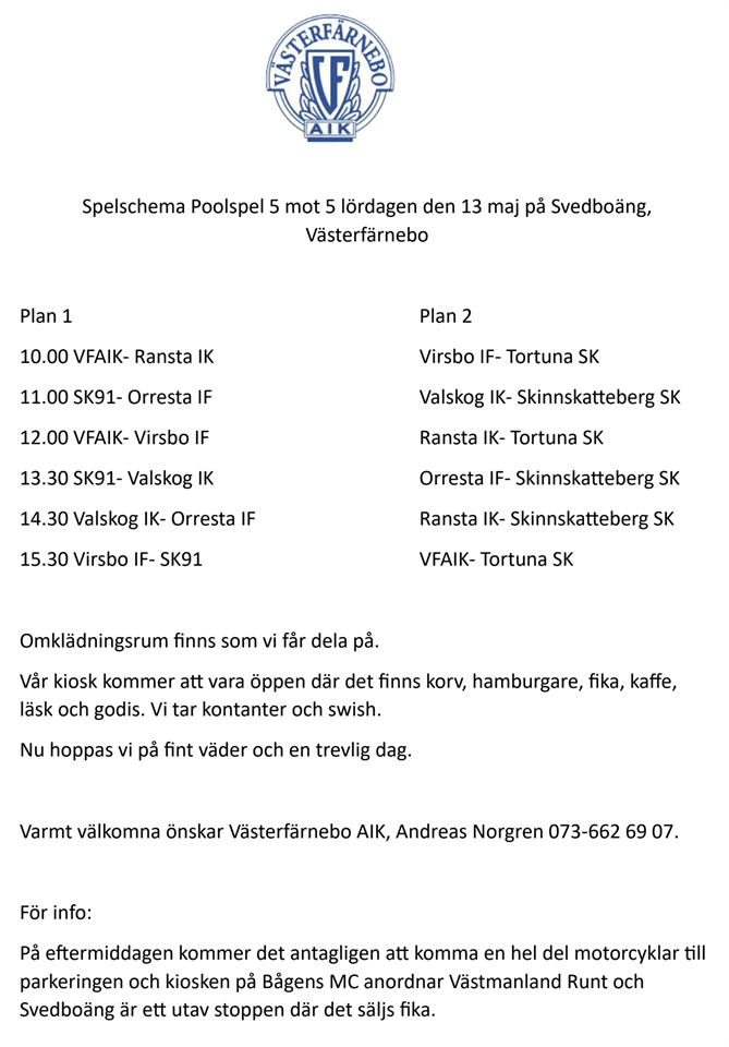 Såg att det gick en automatisk anmälan till veckans träning. Kan ha blivit lite fel... Det som gäller för veckan är: Träning på Tisdag 18-19 på Trollebo. Gräset på Kolbäcks IP är inte redo än, men vi hoppas att vi kan köra igång med ordinarie måndagsträning veckan efter! Har även skickat ut en anmälan till nästa poolspel 13/5, det ser ut att bli en lång dag i Västerfärnebo, första match 11:00 och sista 15:30. Klicka gärna i om ni vet redan nu att ni inte kan vara med! Vi kör samling på plats igen. Vi försöker samlas runt spelplan 30 minuter innan första match! P-15 30 apr 2023 0kommentarer