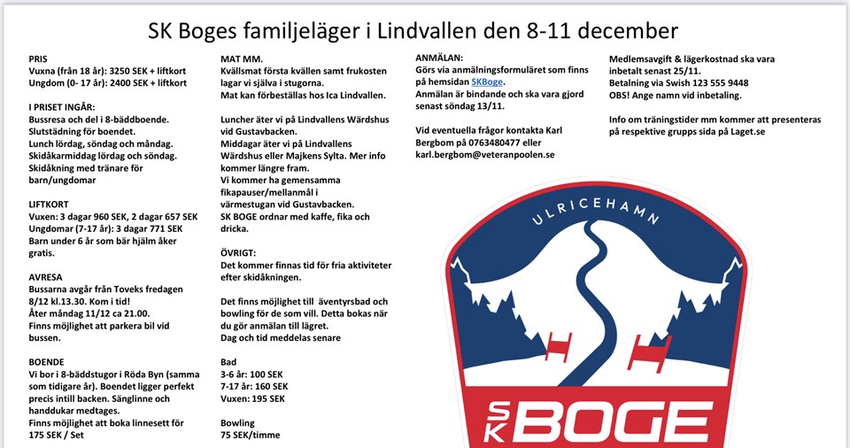 Hej Nu närmar sig säsongens första tävling. Den går av stapeln 3:e och 4:e februari i Falköping. Förra året var det flera U8 som gjorde sin premiärtävling och vi hade roliga dagar! För att anmäla sitt barn så går man till www.ta.skidor.com och letar sig fram till västra Götalands skidförbund. Vill man ha hjälp med detta så kontakta en tränare på nästa träning så guidar vi er! För U8 är det ingen officiell tidtagning, alla får medalj vid målgång av åk 2. Klubben står för startavgift och liftkort för de aktiva på tävlingsdagen. Tyvärr är jag iväg på tränarutbildning denna helgen och kan således inte vara där men det kommer vara andra tränare från klubben som tar hand om och stöttar barnen under dagen. Jag återkommer med namn på den som blir ansvarig. Har ni några frågor så kom fram på nästa träning eller ring på 0703231511 så ska jag svara så gott jag kan! Ta chansen och var med på tävling Med vänlig hälsning, Fredrik U8 23 jan 2024 1kommentar