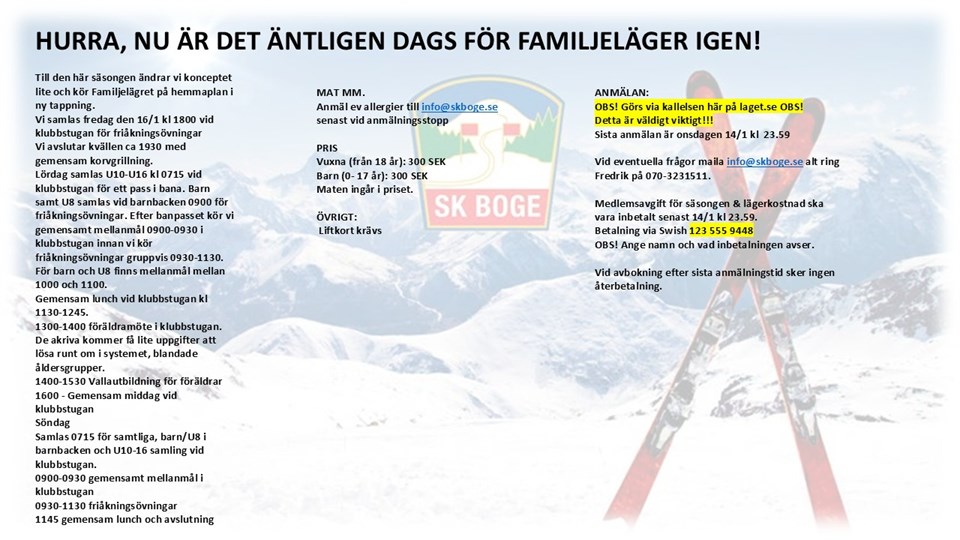 Medlemsavgift för säsongen & lägerkostnad ska vara inbetalt senast 14/1 kl 23.59.