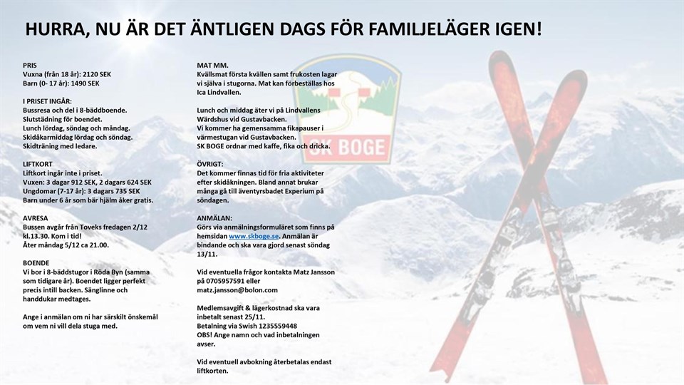 Familjeläger 2022 i Lindvallen Den 2-5 december planerar vi för årets SK Boge familjeläger i Lindvallen. Sista dagen för anmälan och betalning är 25 november. Länk till anmälan här >> SK Boge 15 nov 2022 0kommentarer