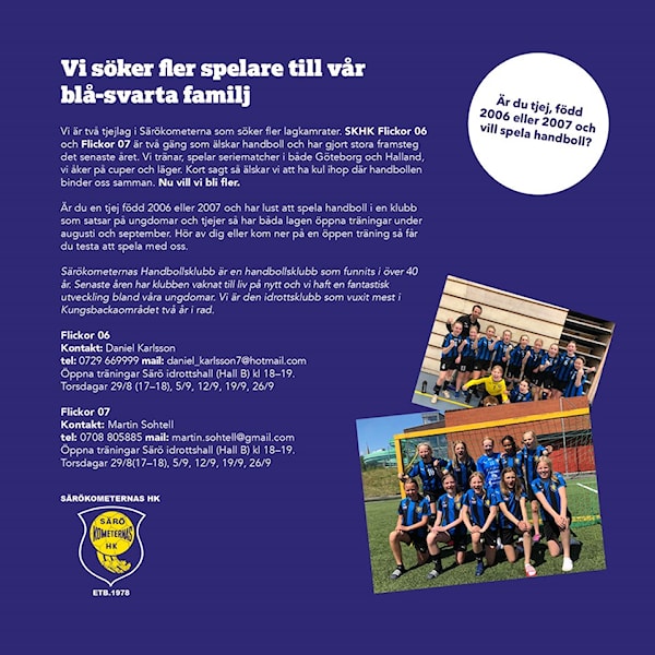 Vi är ett härligt tjejlag i Särökometerna som söker fler lagkamrater. SKHK Flickor 06 är ett gäng som älskar handboll och har gjort stora framsteg det senaste året. Vi tränar ihop, spelar seriematcher i både Göteborg och Halland ihop, vi åker på cuper och läger ihop. Kort sagt så älskar vi att ha kul ihop där handbollen binder oss samman. Nu vill vi bli fler!