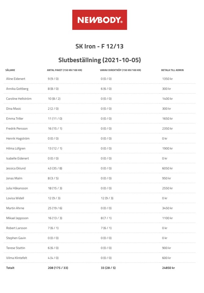 Det har skett en liten kommunikationsmiss gällande uthämtning av New body. Därmed sent utskick! Vi ber om ursäkt för det! Se information från kansliet nedan. (De som ej har möjlighet att hämta sina saker imorgon kan hämta dom uppe på kansliet i efterhand, se hemsida för öppettider). Era beställningar kommer att finnas i Klubblokalen att hämta vid två tillfällen   (Tisdag 19 oktober 18:00-19:00) Onsdag 20 oktober 18:00-19:00   Det ska vara betalt senast 29 oktober till fotbollens BG 5392-8099. För att underlätta skriv vilket lag i meddelanderutan vid inbetalning.     Lista över belopp som ska betalas in bifogas i detta utskick. Bra jobbat med försäljningen! :) Vänligen /Ledarna F-12 19 okt 2021 1kommentar