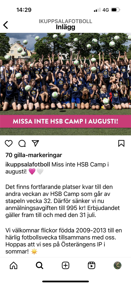 Under v32 (mån-fre) arrangerar IK Uppsala en fotbollsskola för tjejer födda 2009-2013. Passa på att anmäla nu då dem för tillfället har sänkt anmälningsavgiften från 1495kr till 995kr. Mer information och för anmälan finns att hitta på Uppsalafotboll.se under fliken ”HSB Camp” Hoppas ni alla får en fin midsommar! F-12 22 jun 2023 0kommentarer