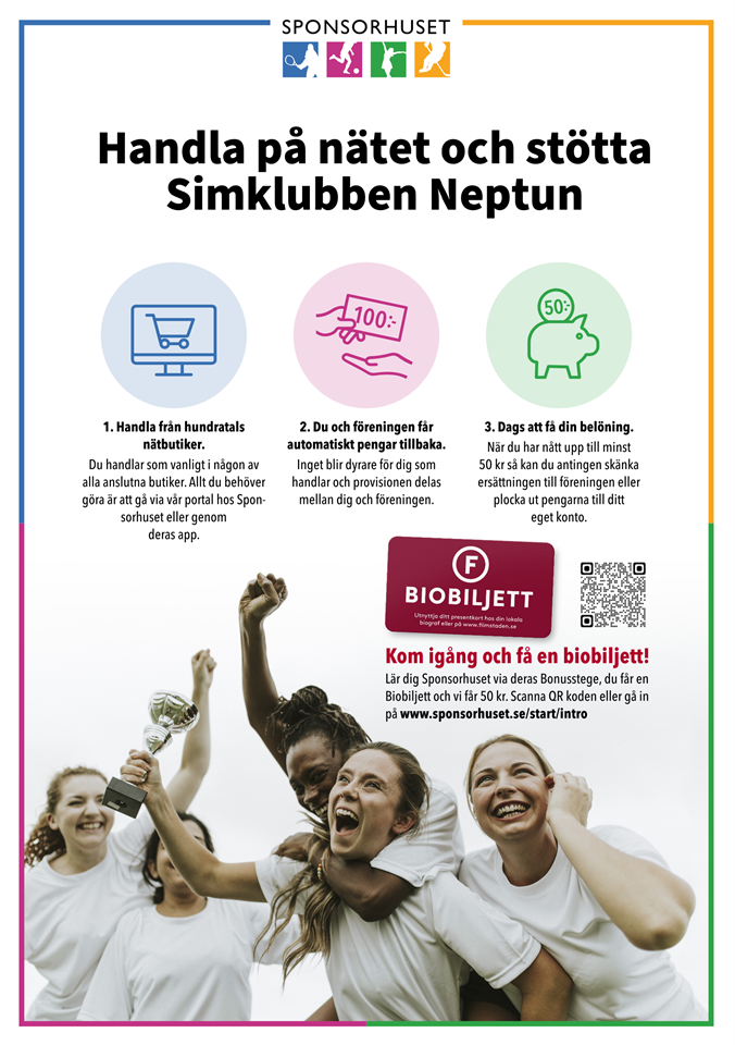 Simklubben Neptun är anslutna till Sponsorhuset. Där kan du handla från över 600 kända nätbutiker. Varje köp som du gör ger pengar både till dig i form rabatter och en donation av nätbutiken till Simklubben Neptun. Klicka här för att komma vidare för mer information