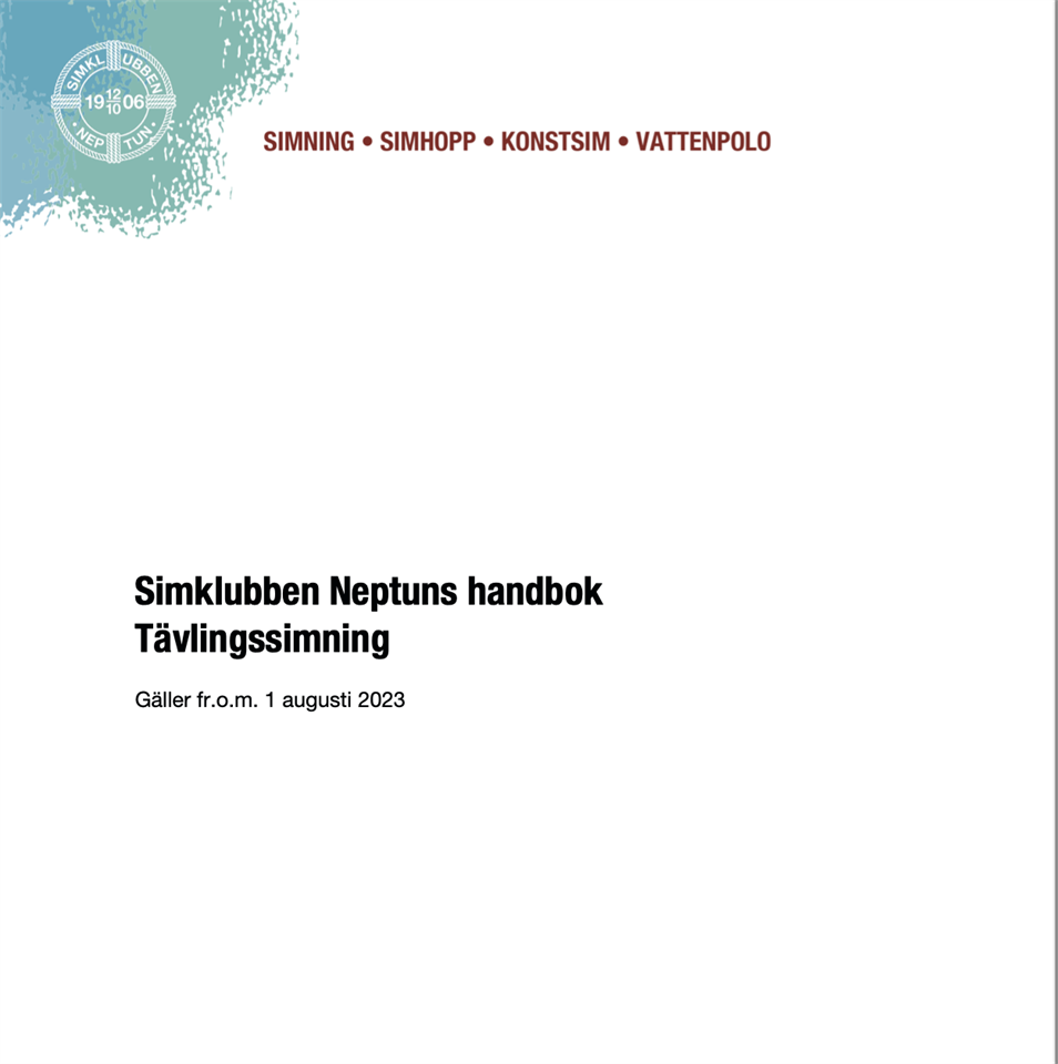 Nu är handboken reviderad och den börjar gälla fr.o.m. 1 augusti 2023. Handboken är en modell, en guide och ett verktyg som ger förutsättningarna att ur såväl ett hälso- som elitperspektiv att utveckla individen så långt den önskar och det är möjligt. Den bygger, utifrån erfarenhet, forskning och framtidsanalys, på hur en optimal och långsiktig utvecklingsprocess kan se ut samt vad vi strävar efter. Handboken är en levande och ständigt växande modell som revideras med jämna mellanrum för att vara i konstant utveckling och följa vår verksamhet. Du finner handboken via Tävlingssimning — Simklubben Neptun (skneptun.se) eller via länkar i gruppsidan på laget.se För respektive grupp finns det checklista alt. bilaga om gruppmål och kriterier. Inom kort kommer de att finnas tillgängliga via respektive grupps laget.se sida. För frågor kontakta ansvarig tränare. Mvh Marie Lindman, Fredrik Henlöv, Kevin Speiner Thorvaldsson, Mikael Rosén, Justin Shields och Roberto Prestinoni och Fredrik Lundin