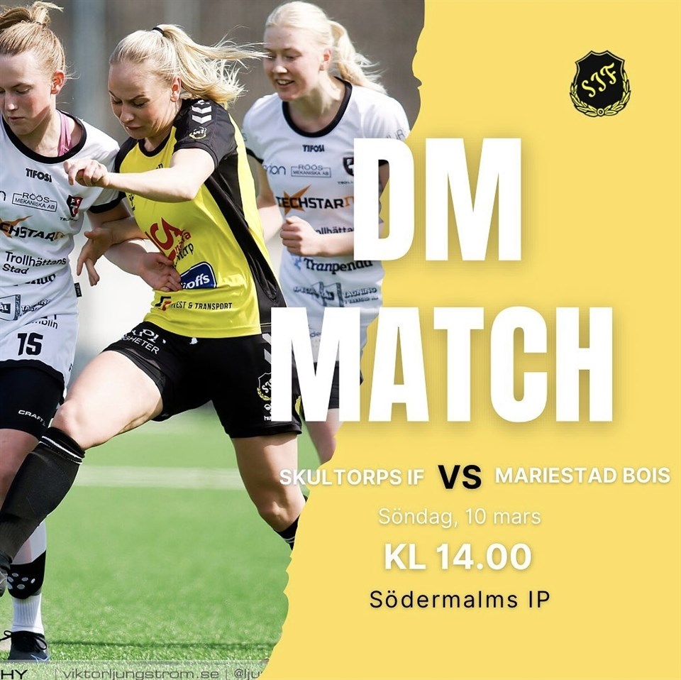 Skövde KIK - Skultorps IF 3-4 ( 2-3 ) Mål: Skultorps IF: Matilda Andersson 2, Caroline Olsson 2. Mål: Skövde KIK: Silvia Lawanhomi 2, Felicia Wilhelmson 1 Vann målrikt derby: ”Lärde oss en hel del” Division 2-laget Skultorps IF ställdes mot division 3-laget Skövde KIK när gruppspelet i DM drog i gång. Skultorps IF vann till slut ett målrikt derby med 4–3 (3–2) på Södermalms IP:s konstgräs på lördagen. Skultorps IF:s tränare Thomas Sjökvist kommenterar: – Jag tycker inte alls att vi är beredda på att tävla på samma sätt som Skövde KIK var i den här matchen. Vi skapade våra chanser på fasta situationer i den första halvleken. Det var en stor skillnad mot matchen mot Vinninga förra helgen, säger han. – Vi har pratat om vissa saker och vi lärde oss en hel del i dag. Vi gör en del saker bra men vi har fortfarande mycket att sätta i spelet. Vi gav bort något läge till dem och som Skövde KIK är duktiga på att utnyttja. KIK var hetare än oss. Vi är jättenöjda med att vi lyckades vinna med 4–3, fortsätter Skultorpstränaren. Skövde KIK:s tränare Mikael Smedberg kommenterar lagets insats: – Man är lite tudelad efteråt. Spelmässigt var det jättebra. Vi står upp jättebra mot ett bra division 2-lag och spelet är helt jämnt. Vi faller på att vi inte klarar av de fasta situationerna i den här matchen. Vi släpper in tre av fyra mål där. Hade vi löst det hade vi vunnit den här matchen. Det är en läropeng för oss, säger han. – Vi har en del nya spelare som ska komma in i laget och i spelet. Vi rullar runt och provar en del nytt i de här DM-matcherna. Spelmässigt håller vi definitivt. Delar av matchen för vi. Det är en helt jämn match som kunde ha gått hur som helst, fortsätter KIK-tränaren.