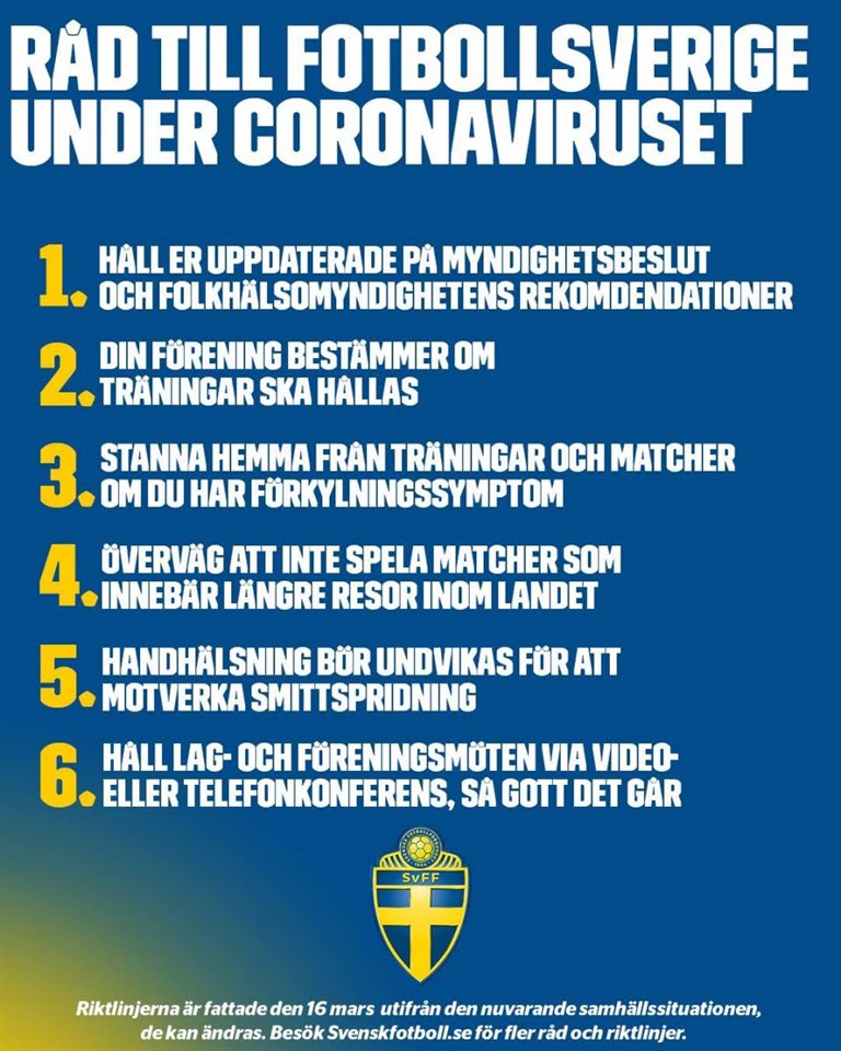 Med anledning av Coronaviruset och dess spridning i Sverige och övriga världen har Upplands fotbollsförbund efter riktlinjer och rekommendationer från SvFF och folkhälsomyndiheten tagit beslut att stoppa all tävlingsverksamhet. Detta innebär att det inte blir några seriepremiärer kommande veckor och start både för serierna under Upplands Fotbollsförbund och Svenska Fotbollsförbundet skjuts upp på framtiden. Eventuellt startdatum finns inte för tillfället utan påverkas av Coronavirusets spridning och folkhälsomyndighetens kommande besult och rekommendationer. Vi kommer inom Skuttunge SK fortsätta träna då det är viktigt både för barn och vuxna med hänsyn till vår hälsa och välbefinnande både på kort och lång sikt. Dock väldigt viktigt att vi följer de rekommendationer som finns gällande hygien, antal utövare och aktivitetsplats. Vi kommer självklart följa utveckling och uppdateringar från myndigheter och vid ny information eller nya riktlinjer i så fall ta nytt beslut angående våra aktiviteter. Viktigt att tänka på: • Den som är sjuk, även med milda symtom, ska inte delta alls, utan stanna hemma till och med två dagar efter tillfrisknande. Insjuknar man under idrottsaktivitet ska man gå hem direkt. • Om möjligt byta om hemma före och efter träning. • Dela inte vattenflaskor, munskydd och liknande som kan överföra saliv. • Ha god handhygien, tvätt händerna ofta och om möjligt använd handsprit. • Undvik handhälsningar. Vi hoppas på en framtida positiv utveckling och att vi, tillsammans med övriga delar i samhället, så småning om kan få starta igång. Under fliken "Dokument" hittar ni de dokument som kommer från SvFF och folkhälsomyndigheten som ligger till grund för Upplands fotbollsförbund och även vårt beslut att fortsätta träna. Damer 3 apr 2020 0kommentarer