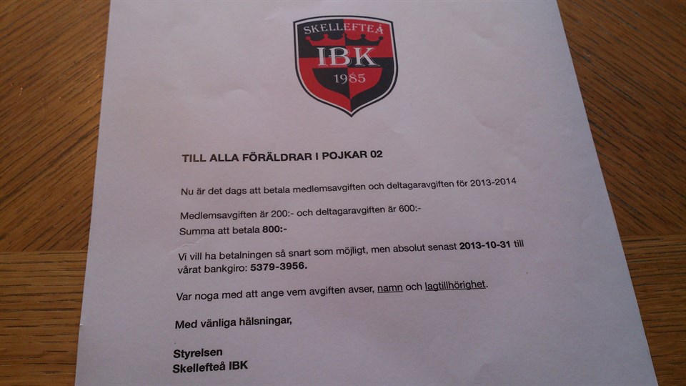 Skellefteå IBK har en årlig säsongsavgift på 800 kr. Se bifogat info från deras styrelse. Summa:800 kr Betalas in på bagiro; 5379-3956 Namn och lagtillhörighet /Ledarna P02 10 okt 2013 0kommentarer