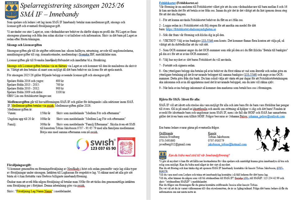 Här kommer information om avgifter för SMÅ IF Innebandy. Informationen finns även som ett dokument. Klicka på "Mer" uppe i menyn och på "Dokument". Alternativt klicka på länken nedan. Spelarregistrering 2025-26