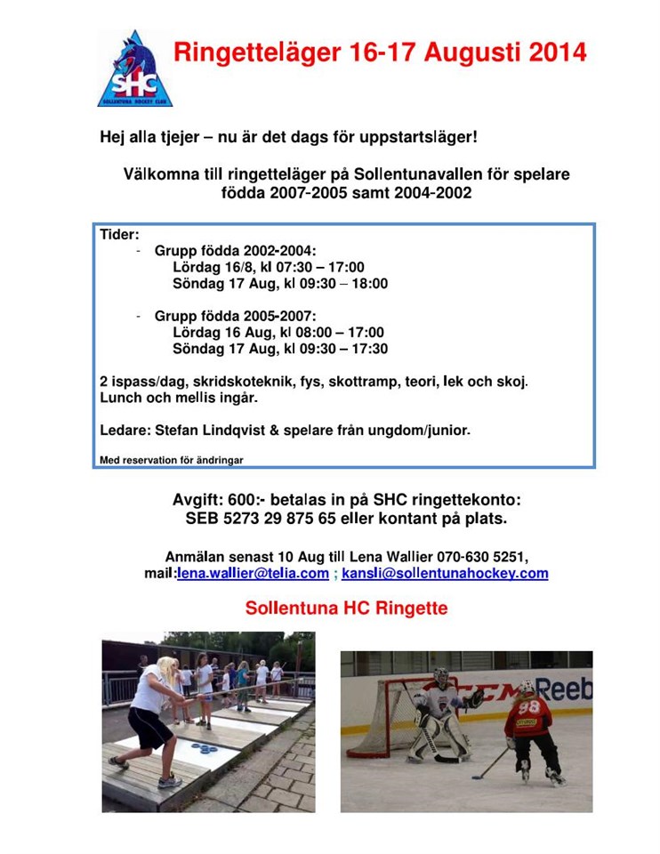 Hej alla Ringette-tjejer och föräldrar! Nu har vi fått klart med istider för årets uppstartsläger på Sollentunavallen. Det kommer att gå av stapeln vecka 33, 16-17 Augusti. Vi räknar med att ha två åldersgrupper, födda 2007-2005 samt 2004-2002, med anpassad träning. Hör gärna av er ifall någon känner sig mer hemma i annan grupp än vad åldern säger, t ex man har spelat med annan åldersgrupp tidigare, har sin bästis där eller man är äldre, men nybörjare. Tider: Lägret börjar lördag 16/8 kl 7:30 för gruppen födda 2004-2002. Vi har då samling och omklädning och går sedan på is 8:00. Gruppen födda 2007-2005 samlas 8:00, byter om och går på is 8:30. Söndag 17/8 börjar samtliga 9:30, då vi inleder med fys. Detaljerat schema kommer att uppdateras efter hand i kalendern: http://www.laget.se/shcringettef/Event/MonthView/2014/08/16 http://www.laget.se/shcringettef/Event/MonthView/2014/08/17 Så, tveka inte, utan skicka in anmälan redan idag! Se även info i bifogad fil/bild. Ange om speciella matbehov/allergier finns. Ange även tröjstorlek - XS, S, M, L, XL. Notera också om spelaren är utespelare eller målvakt. Ni som redan anmält er behöver inte göra detta igen, men komplettera gärna med ovanstående information. Kontaktinfo vid eventuella frågor: Stefan Lindqvist (stefan@thelindqvists.com, 070-256 3800) Lena Wallier (lena.wallier@telia.com, 070-630 5251) Välkomna! Stefan Lindqvist Tränare SHC Ringette Flick