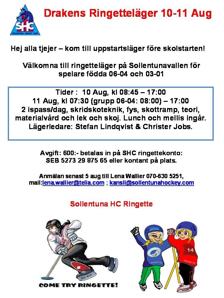 Ringettelägret på Sollentunavallen närmar sig med snabba steg - nu är det mindre än två veckor kvar. Anmälningarna börjar komma in (glädjande nog även flera från andra klubbar än SHC), men det märks att många fortfarande njuter av semestrar och ledighet. Här kommer därför en påminnelse med lite fler detaljer. Vi räknar fortfarande med att ha två åldersgrupper, med anpassad träning. Lägret börjar lördag 10/8 kl 8:45 för samtliga deltagare. Vi har då samling och omklädning och går sedan på is 9:30. Söndag 11/8 börjar första ispasset 8:00 för 01-03 gruppen (samling för ombyte 7:30) 04-06 gruppen går på is 8:30 (samling 8:00) Båda dagarna går vi av isen 16:20. Mer detaljerat schema finns under kalendern. Så, tveka inte, utan skicka in anmälan redan idag! Se bifogad info. Ange om speciella matbehov/allergier finns. Notera också om spelaren är utespelare eller målvakt. Välkomna! Stefan Minior/Ungdom 30 jul 2013 0kommentarer