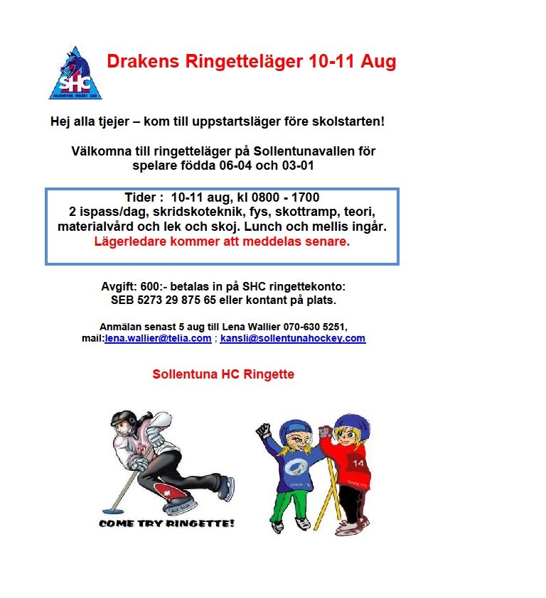 Hoppas suget efter ishallar och skridskoåkning snart börjar infinna sig igen. Här kommer i vilket fall som helst en inbjudan till ringetteläger lördag-söndag 10-11/8 (v32) på Sollentunavallen. Vi hoppas på stor uppslutning och intresse från spelare även utanför SHC. Hjärtligt Välkomna! Minior/Ungdom 5 jul 2013 0kommentarer