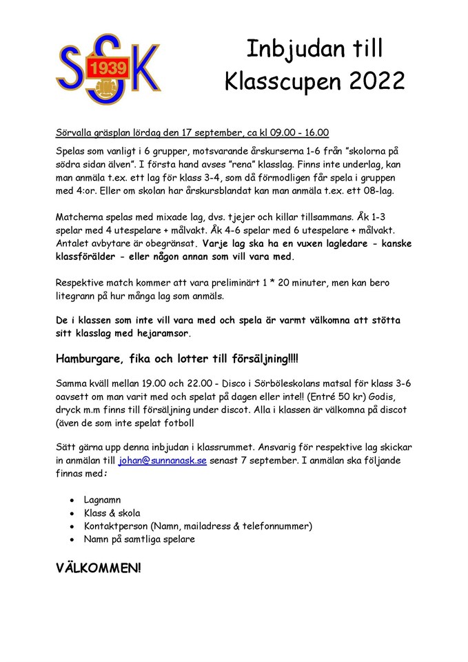Äntligen snart dags för Klasscupen 2022! Se bild för mer information. Om du är sugen på att vara med och det saknas anmälningsblankett i ditt klassrum funkar det även att skriva ut filen på denna länk och ta med anmälan till din klass. Välkommen! F-2014 24 aug 2022 0kommentarer