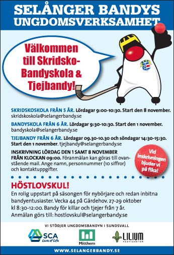 Höstlovskul! En rolig uppstart på säsongen för nybörjare och redan inbitna bandyentusiaster. Bandy för tjejer och killar från 7 år. Plats: Bandyplan Gärdehov Datum: 27-29 oktober Tid: 08.30-12.00 Pris: 100:-/dag eller 200:- för alla tre dagar. (Betalas kontant på plats) Anmälan görs till hostlovskul@selangerbandy.se MVH Undgomskommittén Selånger Bandy