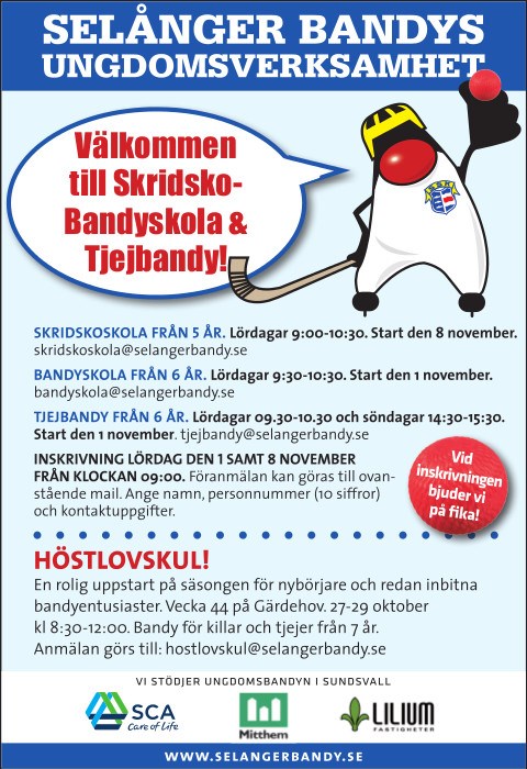 Hej! Jag har lagt in informationsbladet om Bandy-, Skridskoskolan och Tjejbandyn under fliken dokument här på laget.se http://www.laget.se/SSKBandyp0506/Document Hjälp gärna till att sprida det via Facebook, Twitter och andra sociala medier. Vill ni får ni gärna skriva ut och sätta upp den på skolor och liknande. På samma blad finns även lite info om årets höstlovskul. MVH Andreas Ljungström