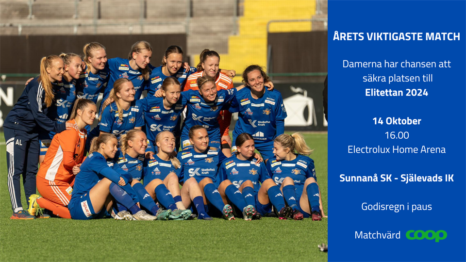 Damlaget har onekligen satt oss i ett mycket bra läge att kunna spela elitfotboll 2024! Seger borta mot Kvarnsveden med hela 11-0 i söndags gör att vi precis som Samir sa i Norran i måndags, att vi har 3 matchbollar i att vinna serien. Via vår serieledning med 7 poäng och endast 3 matcher kvar att spela, så kan vi säkra seriesegern om vi vinner hemma mot Själevad, 16.00 nu på lördag. Vår starka defensiv med endast 11 insläppta mål på 23 matcher och seriens starkaste offensiv med 86 gjorda mål, så är serieledning välförtjänt! På 23 spelade matcher har vi 20 segrar, 2 oavgjorda och endast 1 förlust. Självklart var båda segrarna mot tabelltvåan Team TG, extra viktiga. Nu blir det att kraftsamla och försöka att få minst 500 personer som kommer och stöttar oss i jakten på serieseger! Vi önskar att alla spelare och ledare kommer i Sunnanå SK kläder, gärna matchtröja för spelarna. Godisregn i paus från Coop. Varmt välkomna till E-Lux Home Arena på lördag!! /Krister