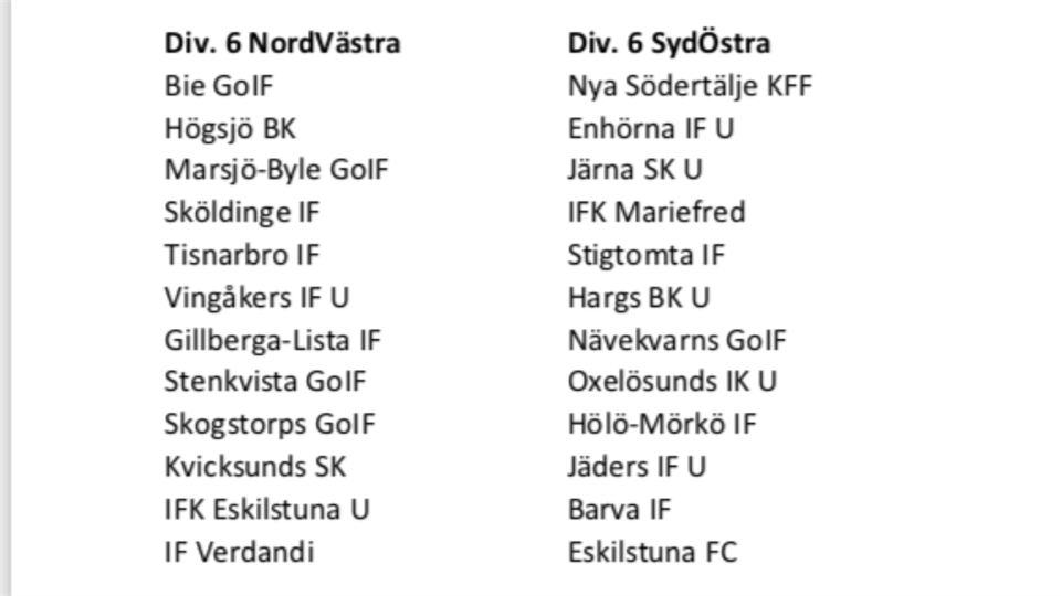 Då har Södermanlands Fotbollsförbundet gjort ett gediget arbete med att dela upp länets division 6-lag. Notera att de av "rättviseskäl" delat upp Eskilstuna-lagen för att resorna ska fördelas bättre. Hur det blir med det låter vi vara osagt men indelningen i sig ser ok ut. Nedan ser ni serien. Division 6 Nordvästra 2018 Stenkvista GoIF Bie GoIF Gillberga-Lista IF Högsjö BK IF Verdandi IFK Eskilstuna U Kvicksunds SK Marsjö-Byle GoIF Skogstorps GoIF Sköldinge IF Tisnarbro IF Vingåkers IF U Som ni ser innebär indelningen lite nya bekantskaper och vi ser fram emot att besöka idylliska fotbollsplaner under säsongen. Herrlag 24 feb 2018 0kommentarer