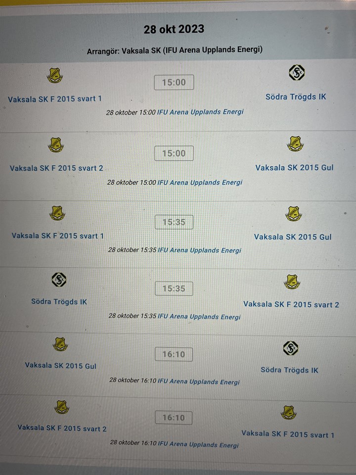 Hej! Äntligen är det dags för matcher på lördag! Vi kör efter tidigare info och samlas klockan 12:45 i Lillkyrka för ombyte. Vi satsar på att vara i Uppsala (IFU Arena) strax innan 14:00. Matcherna har skjutits fram med 15 minuter enligt bild. (15:00- 15:35 och 16:10. Laget som vi har till matcherna på lördag just nu: 1. Jolina 2. Freja 3. Wilma 4. Ellie 5. Idun 6. Liv 7. Tilia 8. Emmy Emmy har anmält sig nu ikväll! 👊 Vi har såklart plats för fler spelare! 😀👍 Anmäl i sms-gruppen! Jag har tagit med klubbor och glasögon att låna! Syns på lördag!! 12:45! Mvh // Tränar'n Innebandy F-14/15 25 okt 2023 1kommentar