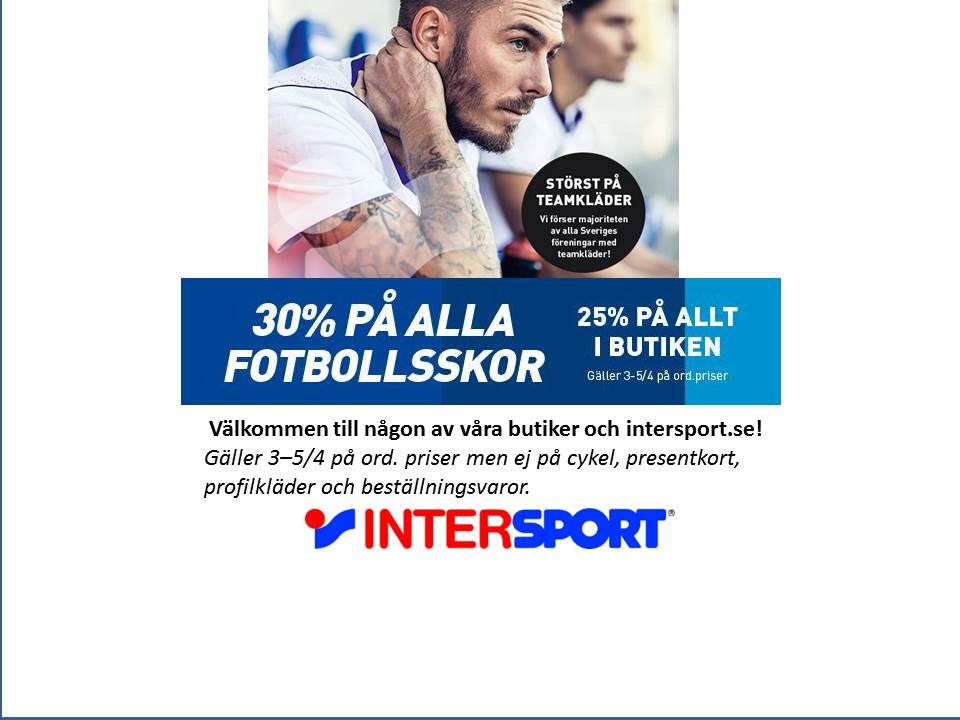 FÖRENINGSDAGAR 3-5/4 Tillsammans med INTERSPORT bjuder vi nu in dig och dina föreningskamrater till våra föreningsdagar! Som medlem i en av våra samarbetsföreningar får du 30% på alla fotbollsskor och 25% rabatt på resten av sortimentet i butiken eller på intersport.se . Ta med inbjudan till butiken eller visa upp den i din smartphone för att erhålla rabatten. Eller använd följande rabattkod: 9982017112727 på intersport.se. P12-14 2 apr 2018 0kommentarer