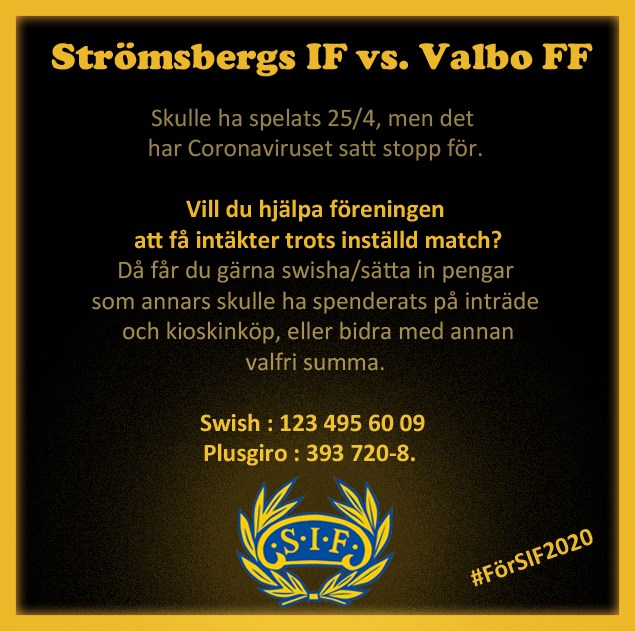 Matchdag imorgon lördag, eller det var den ursprungliga planen innan Coronaviruset satte stopp för alla matcher i dagsläget. Vi skulle ha mött Valbo FF i säsongens andra hemmamatch i seriespelet med avspark 13:00. Vill du ändå vara med och bidra och göra så att föreningen får en intäkt trots att det är ett evenemang vi går miste om, så kan du betala inträde till match du inte får se. Eller handla i kiosken även om den är stängd och du aldrig får just den korven eller fikat som du skulle ha köpt. Tillsammans kan vi göra den tänkta matchdagen till något bra för SIF trots rådande omständigheter! Bidra om du kan och vill med helt valfri summa. Hjälp oss att dela informationen på sociala medier, vilket är till stor hjälp även om ni inte vill eller har möjlighet att bidra ekonomiskt, eller redan har gjort det. Swish : 123 495 60 09 Plusgiro : 393 720-8. Märk inbetalningen #FörSIF2020 möjligen även om det är inträde eller vad du inhandlar i kiosken. Här kan du läsa mer om insamlingen #FörSIF2020, och hur Coronaviruset påverkar föreningen ekonomiskt. Det går självklart utmärkt att betala sitt inträde och/eller inköp i kiosken redan nu. Strömsbergs IF tackar på förhand för ditt bidrag!