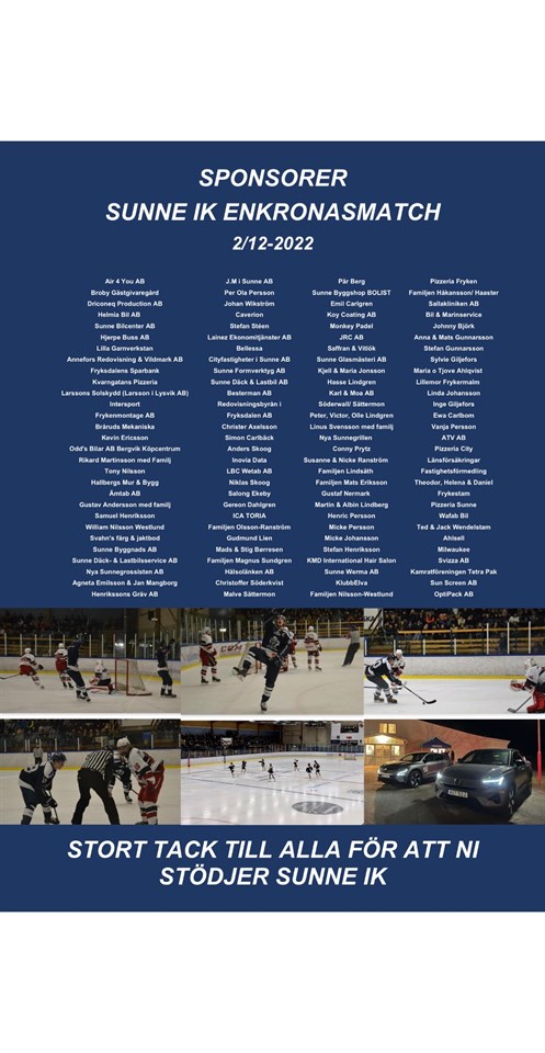 GOD JUL ALLA SIK-VĂNNERđđ I januari Ă€r det dags igen att samla alla du kĂ€nner!Till Helmia Arena fĂ€rden bör gĂ„, sĂ„ hoppas vi grabbarna Ă€r vakna och pĂ„ tĂ„. Om inte, de troligtvis i tredje vaknar, SĂ„ sĂ€tter de lĂ€tt puckarna vi saknar. Tack för stödet i höst, och vĂ€lkomna Ă„ter, kan man hoppas SIKSUPPORT Ă„ter pĂ„ lĂ€ktaren lĂ„ter? HöstsĂ€songen har gĂ„tt fort, mycket har hĂ€nt, och det var vĂ€l lĂ€ngesedan vĂ„r förening var sĂ„ pĂ„ tapeten som vi Ă€r nu.đ Fredrik FinnebrĂ„th pĂ„ Fryksdalsbygden listar oss som nummer sex pĂ„ listan av topp tio idrottsprestationer i Sunne under 2022đ Motiveringen frĂ„n Fredrik lyder: âSunne IK:s förvandling, bĂ„de pĂ„ och utanför isen, Ă€r Ă€n i dag svĂ„rt att greppa. Framförallt att det gick sĂ„ snabbt. Det finns inget lag i kommunen som drar i nĂ€rheten lika mycket Ă„skĂ„dare till sina matcher som Sunne IK. Varje match bjuds de dessutom pĂ„ show, frĂ„n att förra sĂ€songen inte ha vunnit en enda match efter fulltid i Hockeytrean, har SIK vunnit alla sina tio matcher den hĂ€r hösten. Hade jag haft en hatt hade jag lyft pĂ„ den nu.â Fantastiskt kul tycker vi, och ett bevis pĂ„ att vi vĂ„rt arbete lönar sig. HöstsĂ€songen dĂ„, jo dĂ„ den har bjudit pĂ„ nĂ„gra godbitar, topp tre listar vi nedan.đ HĂSTENS MATCH: HĂ€r Ă€r det tvĂ„ matcher som sticker ut lite extra, nostalgikvĂ€llen med SIKSUPPORT, och enkronasmatchen. BĂ„da matcherna med bra publikstöd, pĂ„ enkronasmatchen kom det 711 personer, allt runt omkring blev otroligt lyckat och som grĂ€dde pĂ„ moset blev det en 7-1 vinst. MEN, undertecknad hĂ„ller nog SIKSUPPORT-matchen som snĂ€ppet högre, Ă€ven om det var ca 100-150 personer fĂ€rre pĂ„ lĂ€ktaren sĂ„ var Ă€ven denna match en riktig höjdare. Comeback för sĂ„vĂ€l SIKSUPPORT som för Robin Johansson, bra drag i bĂ„de sĂ„ng, trumma och intag av sportdryck ()av den klassiska supportergruppen och kvĂ€llen avrundades med mĂ„nga skratt, skĂ„lar, och gamla som nya minnen pĂ„ GĂ€stis.đ Framtidstro andades och visst vill vi sĂ€tta SIK pĂ„ hockeykartan igen, vi ligger trots allt pĂ„ en tredjeplats gĂ€llande publiksnittet i hockeyvĂ€rmland, endast passerade av en klubb frĂ„n Karlstad samt Karlskogađ HĂSTENS PRESTATION: Enkelt, hĂ€r Ă€r det tvĂ„ tredjeperioder som sticker ut, Charlottenberg och Filipstad borta. I bĂ„da matcherna vĂ€nder vi 5-1 underlĂ€gen i tredje till vinst 5-6. Detta Ă€r nĂ„got man knappt fĂ„r uppleva i seniorhockey, och att göra det tvĂ„ gĂ„nger pĂ„ tre veckor bevisar bara att man aldrig kan rĂ€kna ut Ă„rets upplaga av SIK, och vi Ă€r dĂ€rmed obesegrade. đȘđ”âȘ Höstens hjĂ€ltar: Grabbarna i bakgrunden som aldrig syns eller hörs, (ja,förutom Stefan dĂ„) Som dagligen slipar, fixar och donar, Kjell, Stefan, Lars Ă och Nisse.Vad gjorde vi utan er? đ đ