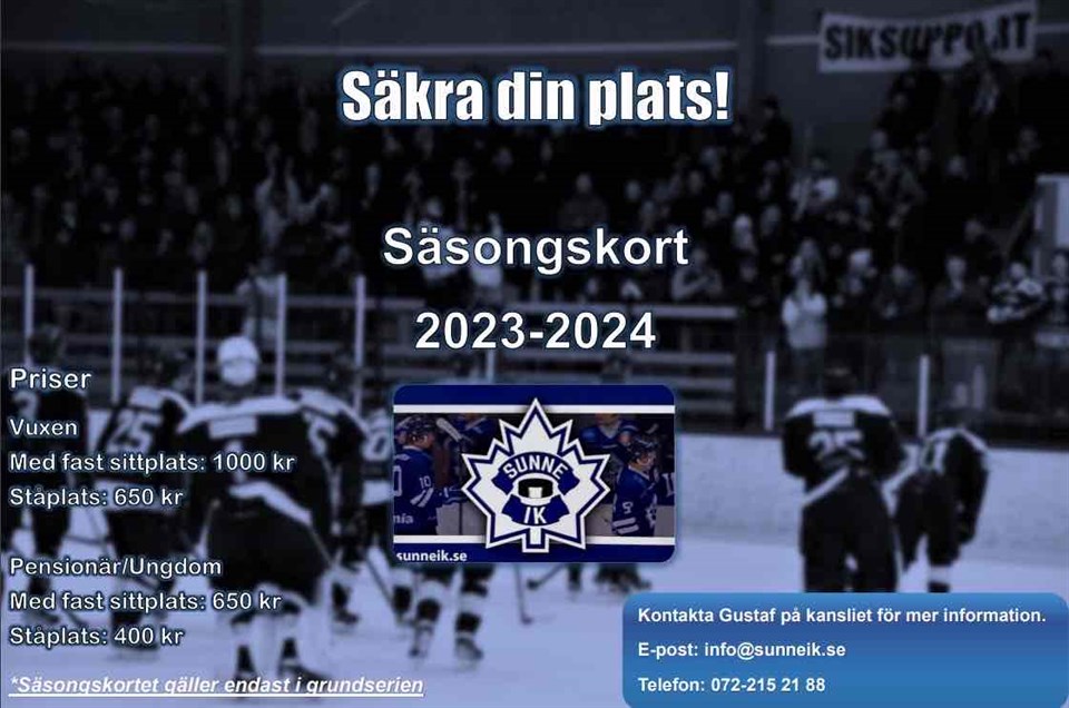 SĂ€kra din plats redan idag! SĂ€songskort 2023-2024!đ Priser: Vuxen SĂ€songskort med sittplats: 1000 kr SĂ€songskort stĂ„plats: 650 kr Priser: PensionĂ€r/Ungdom SĂ€songskort med sittplats: 650 kr SĂ€songskort stĂ„plats: 400 kr *SĂ€songskortet gĂ€ller endast grundserien Kontakta mig Gustaf pĂ„ kansliet för mer information!đ E-post: info@sunneik.se Telefon: 072-215 21 88 â #đ”âȘ