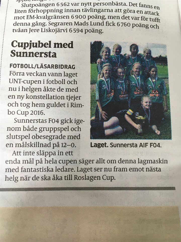 Tre helger, tre cuper, tre guld. Först UNTcupen, sedan Rimbocupen och nu i helgen har vi deltagit med två fantastiska lag i Roslagscupen. Tjejerna har kämpat och spelat jättefin fotboll i spöregn, blåst och kyla och avslutade med att spela ut hela sitt register i finalen mot Östhammar under söndagen. Mellan alla matcher har de spelat kort, skrattat, kollat på film och haft mys. Trots en del onda fötter, knän och tår verkar de ändå rätt nöjda, iallafall om man skall döma av bilderna vi lyckats ta under helgen:-) Vi ledare är så stolta över dessa fantastiska tjejer och glada över att vi får vara en del av deras fotbollsresa! Titta gärna på filmsnutten från lagens uppladdning inför slutspelsdagen - det var magiskt! Filmen ligger under video på laget.se Ett kortare bildspel från helgen finns också på: https://flipagram.com/f/rA1tZUUNOy /Ledarna genom Petra