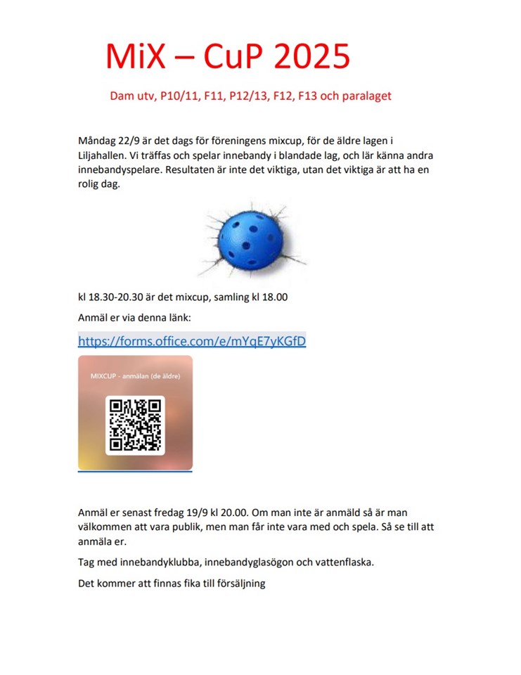 Måndag 22/9 är det dags för föreningens mixcup, för de äldre lagen i Liljahallen. Vi träffas och spelar innebandy i blandade lag, och lär känna andra innebandyspelare. Resultaten är inte det viktiga, utan det viktiga är att ha en rolig dag. Kl 18.30-20.30 är det mixcup, samling kl 18.00 Anmäl er via denna länk: https://forms.office.com/e/mYqE7yKGfD Anmäl er senast fredag 19/9 kl 20.00. Om man inte är anmäld så är man välkommen att vara publik, men man får inte vara med och spela. Så se till att anmäla er. Tag med innebandyklubba, innebandyglasögon och vattenflaska. Det kommer att finnas fika till försäljning