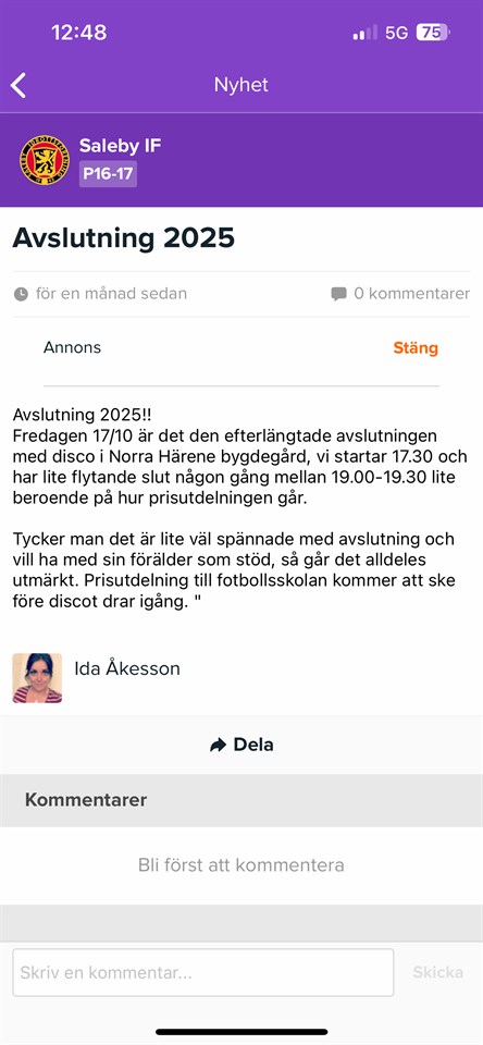 Klicka på bekräftelselänken i det mejl vi skickat dig för att börja ta emot uppdateringar från Saleby IF P16-17.