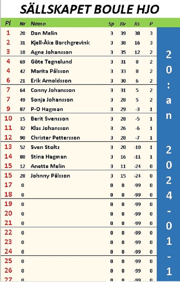 Tabellen efter dagen tävling Sällskapet Boule Hjo 10 jan 2024 0kommentarer