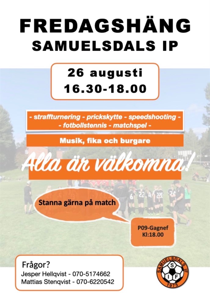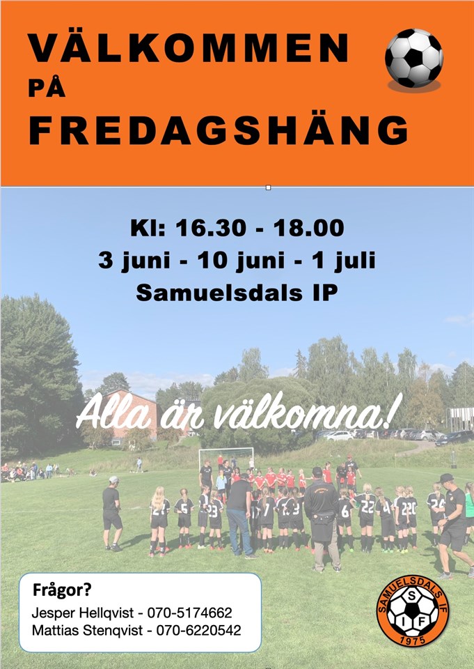 NYTT FÖR DENNA FREDAG: FINT VÄDER, -FÖRSÄLJNING OCH TRIXPROMENAD!!! Alla barn och ungdomar, kom och lira boll och häng. Roliga fotbollsaktiviteter - straffturnering, prickskytte, speedshooting, fotbollstennis, matchspel. Ledare finns på plats med bollar, musik och korv/fikaförsäljning (betalning via Swish eller kontant) Alla är välkomna! Man behöver inte vara medlem i föreningen. Samuelsdals IF 8 jun 2022 0kommentarer