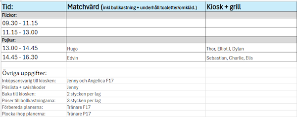Såhär ser schemat ut (behöver ni byta pass får ni lösa det sinsemellan):