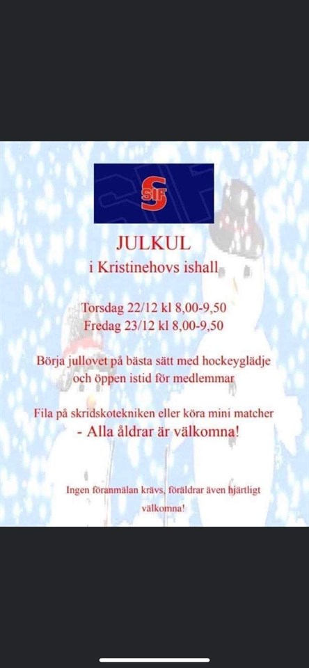 22/12 samt 23/12 går det att vara på is kl 08:00-09:50. Öppen istid för medlemmar i olika åldrar samtidigt.