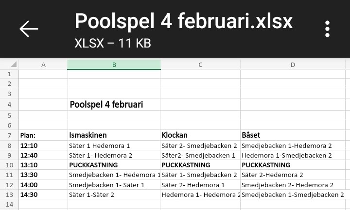 Hej! Nu på söndag skulle vi haft hemma poolspel men vi har nu fått ställa in det pga att j18 ska ha match då. Så alltså inget hemma poolspel på söndag. Borlänge har erbjudit sig att kolla upp om de har någon tid i Borlänge ishall så vi kan spela poolspelet där istället. Vi kommer att skicka ut en kallelse så återkommer vi så fort vi hör något från Borlänge om det blir något poolspel. Trevlig kväll! Mvh ledarna U11 Team 15 23 jan 2024 0kommentarer