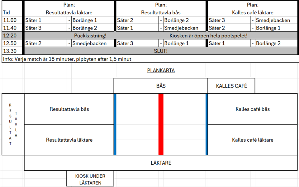 Hej! På lördag var det äntligen dags igen för lite matcher igen för barnen födda -18. Vi kommer att spela 2st matcher mot Borlänge och en mot Smedjebacken. Vi är 21st anmälda till matcherna, så vi kommer att spela med 3 lag, 7 spelare i varje lag. Vi samlas 10.15 i omklädningsrummet (vilket får vi se på lördag). Där kommer vi berätta vilket lag man spelar i och matchtröjor kommer att delas ut. Vill man ha skridskor slipade så önskar vi att ni kommer tidigare, då tiden blir tajt ifall fler vill slipa. Sen kommer vi behöva hjälp med sargbygge inför matcherna, ni ser enligt bild hur planera skall vara uppbyggda(3 st planer) Kim Larsson sköter klockan. Vi söker fortfarande någon som kan vara speaker. Om man blir sjuk eller av annan anledning inte kan deltaga på lördag, hör av er så snart ni vet till någon av oss tränare. Anton 070-7388893 Patrik 073-5673781 Staffan 070-7339505