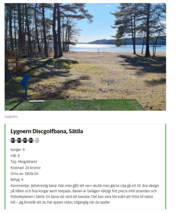 Kommentar: Jättetrevlig bana. När man gått ett varv skulle man gärna vilja gå ett till. Bra design på hålen och fina korgar samt teepads. Banan är belägen väldigt fint precis intill stranden och fotbollsplanen i Sätila. En bana väl värd att besöka. Det kan vara lite svårt att hitta till nästa hål – jag föreslår att du har appen Udisc tillgänglig när du spelar.