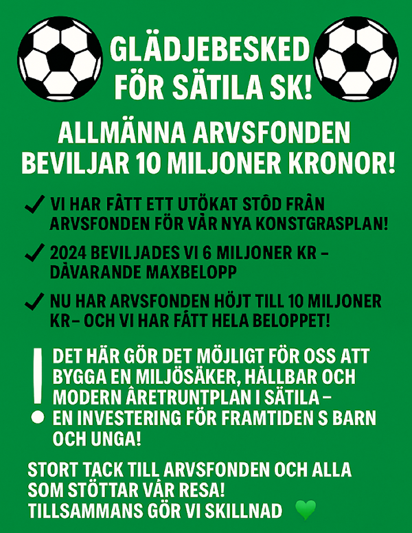 Det här är en enorm möjlighet för vår förening och innebär att vi kan satsa fullt ut på att anlägga en miljösäker, hållbar och modern åretruntplan i Sätila – något som kommer hela bygden till nytta. ⚽