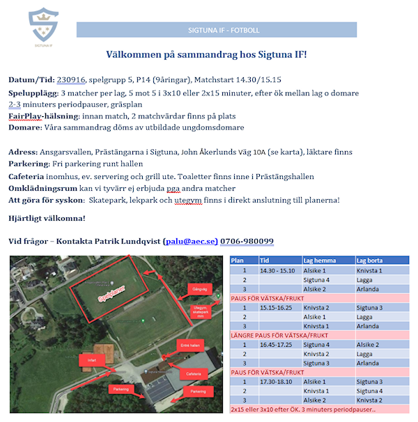 Hej Anna. Tack för tydlig information. 🙏 Kommer förbi med hembakat om jag hinner. Kanske en sockerkaka eller kärleksmums. Får se om jag hinner baka. Lycka till alla fotbollsspelare, ledare, föräldrar och café- och grill ansvariga i helgen. Håller tummarna för fint väder.