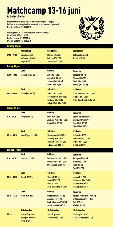 Vi ville bara påminna er om att det är matchcamp nästa helg den 14-16 juni. Ett arbetspass är obligatoriskt som medlem i Siljansnäs IF, se schemat. Detta är den enda insatsen man behöver göra som medlem. Vill ni byta arbetspass så gör de detta mellan varandra och meddela sen Fredrik Hultberg 072-1582215 om förändringarna. Om någon inte kan stå på sitt pass så är det upp till er att lösa den situationen. Som ni ser i arbetsschemat så står det efternamn och vilket lag man tillhör. Detta innebär att de med fler än ett barn är de som kan ha fått två pass. Har man frågor gällande schemat kan man höra av sig till Fredrik Hultberg, 072-1582215. Mvh tränarna Mixlag 17-18 9 jun 2024 0kommentarer