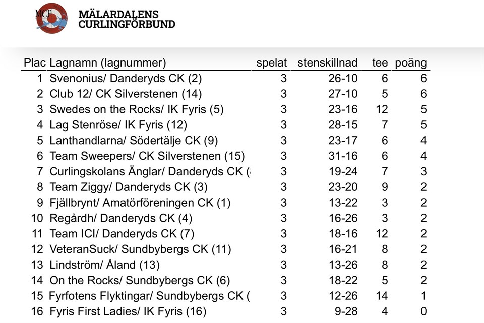 - Vi gick runt på sex personer idag, men det funkade bra. Vi släppte en onödig femma mot Club 12 där vi kunde ha gjort det bättre, men stabilt spel i alla tre matcherna av oss tycker jag. Sen tror jag att vi hade en stor fördel med isen här idag - inte lätt att komma hit på en blixtsnabb is med lite curl för de gästande lagen, kommenterar Stefan Persson det första sammandraget för Team Sweepers del.