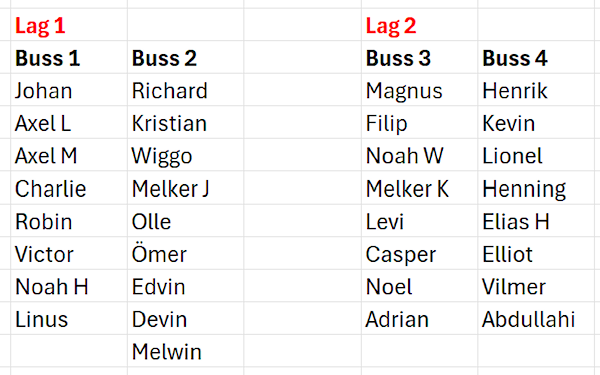 Samling Idrottsgården 10.30 för packning i de fyra minibussarna vi har hyrt under cupdagarna. Se bifgoad fil för buss- och lagindelning.