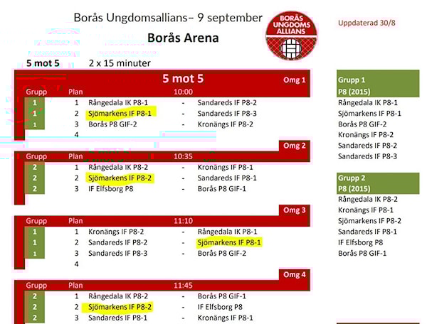 Vi kommer ställa upp med två lag och samling är som tidigare kommunicerats på Sjömarkens idrottsgår 8.45 nu på lördag för ombyte och därefter avfärd mot Borås Arena.