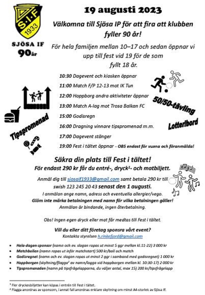 Välkomna till Sjösa IP för att fira att Sjösa IF fyller 90 år! Lördagen den 19 augusti arrangerar vi för hela familjen från klockan 10.00 till klockan 17.00. Ungdomslaget spelar match mot IK Tun 11.00, seniorlaget tar emot Trosa Balkan FC 13.00. Under dagen kommer vi ha kiosk, godisregn, hoppborg, tipspromenad och säkert något mer. Klockan 17.00 stänger vi för att svida vi om och det blir under kvällen fest för ett mer slutet sällskap av medlemmar: Fest i tältet! Ni kan säkra er plats på festen för 290 kronor och då ingår entré, mat och en dryckesbiljett. Anmäl dig till sjosaif1933@gmail.com samt betala 290 kr till swish 123 245 20 43 senast den 1 augusti. I anmälan ange namn, adress och eventuella allergier/vego. Glöm inte märka betalningen med namn för vilka betalningen gäller! Anmälan är bindande, ingen återbetalning. Obs! Ingen egen dryck eller mat får medtas till Fest i tältet. Vill du eller ditt företag sponsra vårt event? Kontakta styrelsens Henrik Rinkefjord på mail: h.rinkefjord@gmail.com • Hela-dagen-sponsor (namn och ev. slogan ropas ut minst 5 ggr mellan kl.11-22) 3 000 kr • Matchbollen (namn ropas ut inför matchstart) 500 kr/boll och match • Godisregnet (namn och ev. slogan ropas ut minst 2 ggr i samband med godisregnet) 1 000 kr • Hoppborgen (skyltning/flagga av namn/logga vid hoppborgen mellan kl. 10:30-17.00) 2 000 kr • Tipspromenaden (namn på tipsfrågelapparna, du väljer antal, max 15) 200 kr/tipsfrågelapp