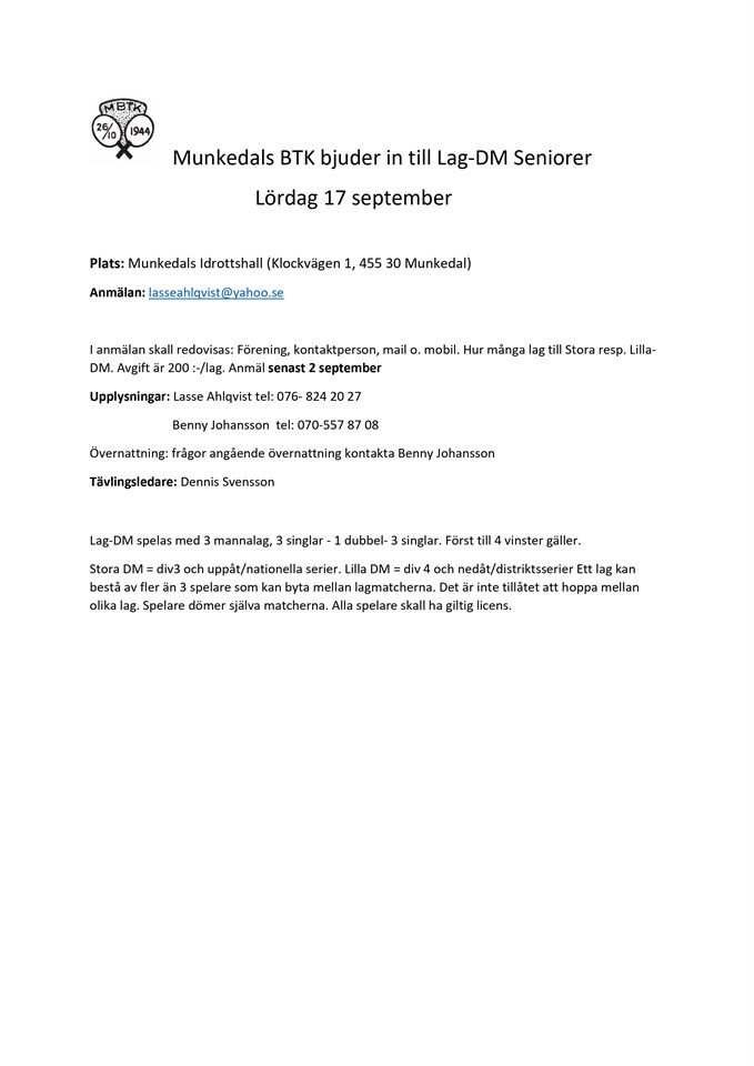 Mejl från förbundet: Ni är varmt välkomna att spela årets lag-DM som kommer spelas på ett annat vis i år! Ni hittar all information i bifogad inbjudan! Hälsningar Kind regards Karin Gill Nordvästra Götalands Bordtennisförbund Inbjudan