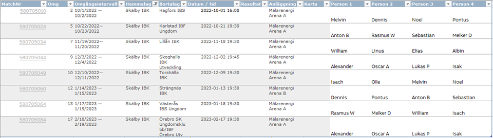 Under våra hemmamatcher behöver vi två person i sekretariatet och två till kiosken. I bifogad lista ser ni vilka som ansvarar för vilka matcher. Vem som gör vad kommer ni själva överens om. Vid förhinder så ansvar var och en för att ens plats tillsätts. Under första matchen nu på lördag kommer Martin Götman att instruera hur sekretariatet fungerar; alla som kan tänka sig att sitta där rekommenderas därför ansluta. Han är där från halv fyra. Linda Henriksson är kontaktperson vad gäller kiosken och väl insatt i hur den ska drivas. Linda kommer att vara behjälplig även vid tillfällen hon själv inte står i kiosken.